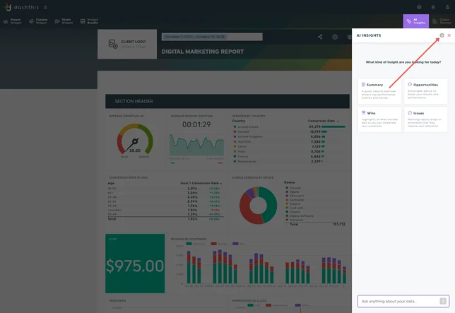 Na DashThis, a nossa missão sempre foi tornar os relatórios de marketing simples e perspicazes. Vocês nos disseram que, embora as nossas informações gratuitas de IA sejam ótimas para uma visão geral rápida, vocês querem ir mais a fundo, fazer perguntas personalizadas, adicionar contexto comercial e obter informações adaptadas aos seus objetivos.