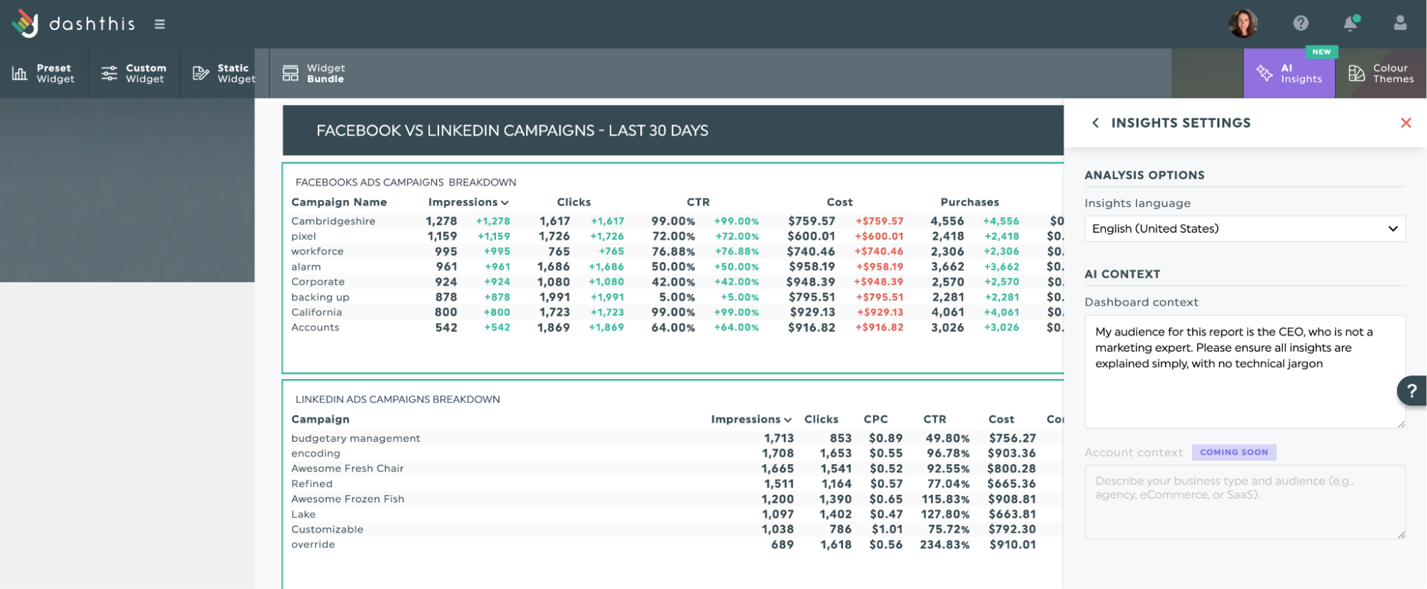 A IA da DashThis adapta as informações do seu painel às suas necessidades específicas. Com o AI Insights Pro, pode descrever o seu público e o que é importante para ele, e essas informações moldam a análise. Isso ajuda a produzir conclusões claras para leitores sem conhecimentos técnicos.
