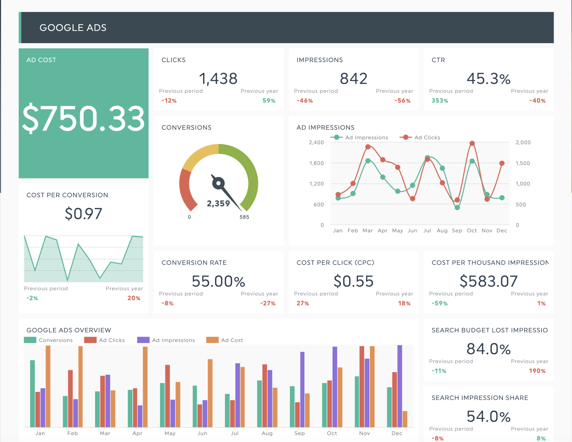 O nosso modelo de relatório PPC permite visualizar o desempenho, mostrando as métricas do Google Ads ao lado dos dados do Bing Ads e dos resultados da página de destino: