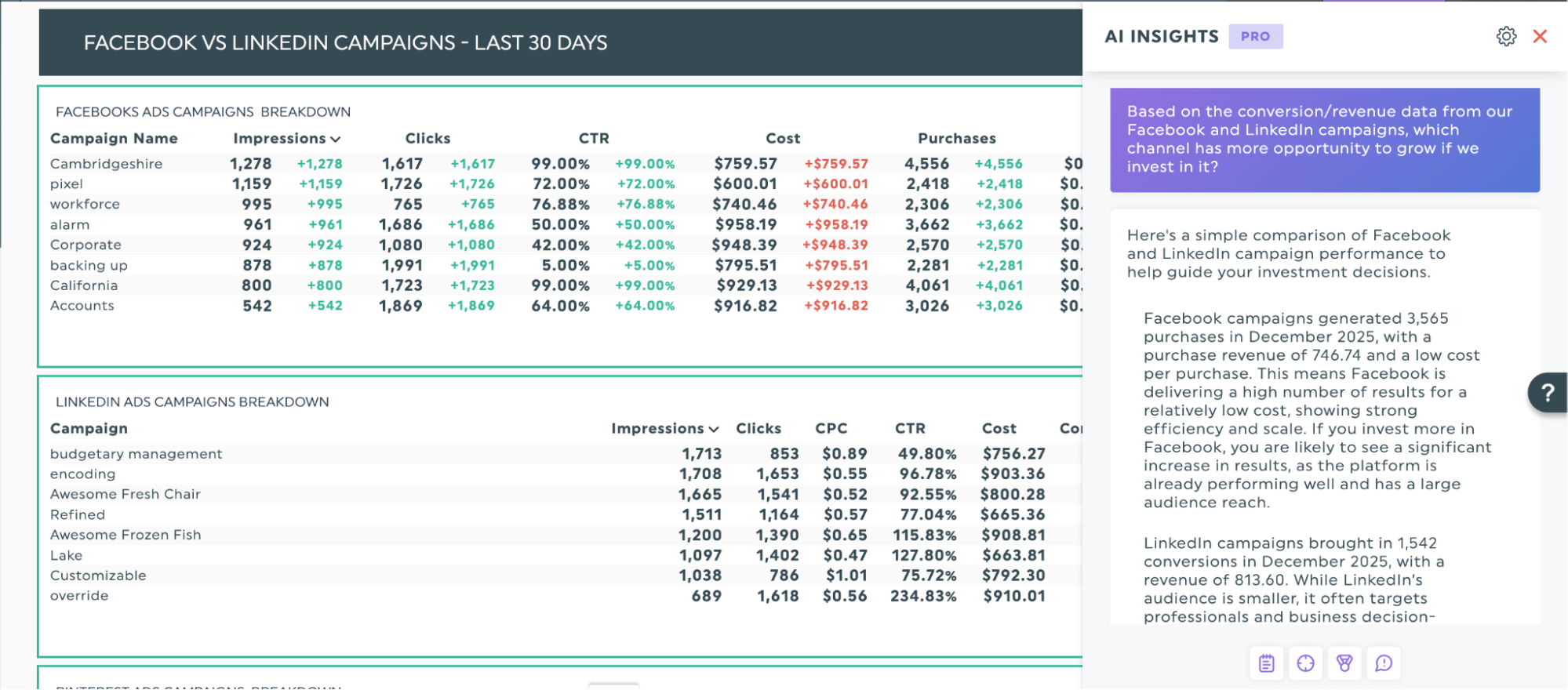 Digamos que esteja a comparar dados de conversão de anúncios do Facebook e campanhas do LinkedIn. A nossa IA pode fornecer orientações práticas sobre um único ponto de comparação, como dados de conversão e receita para canais específicos.