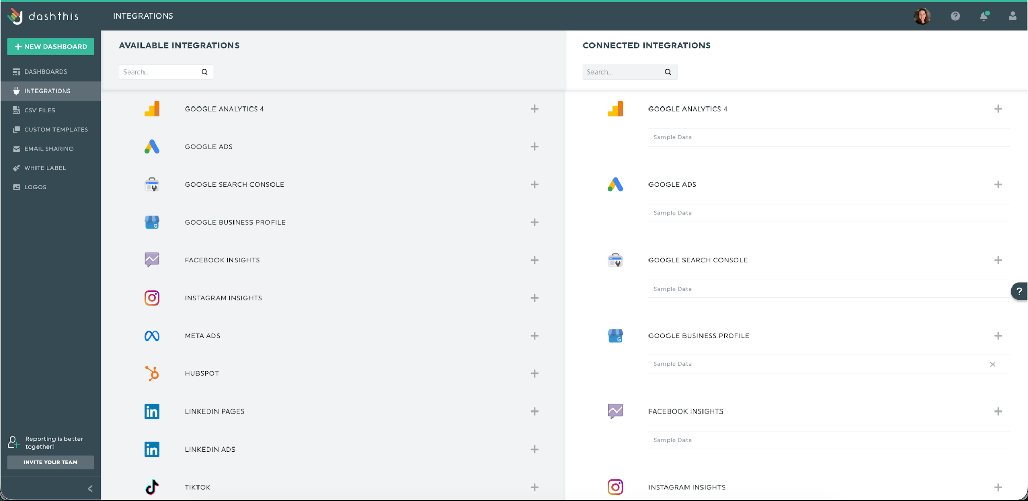 Pode importar os seus dados manualmente, exportando-os de cada plataforma e verificando se tudo está correto. Mas esse processo consome horas que poderia dedicar à estratégia. Utilize uma ferramenta de relatórios como o DashThis, com mais de 34 integrações, para extrair dados das suas ferramentas de marketing diretamente para o seu relatório de análise.