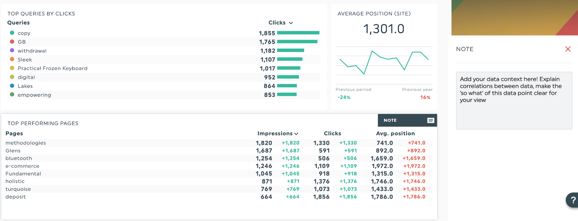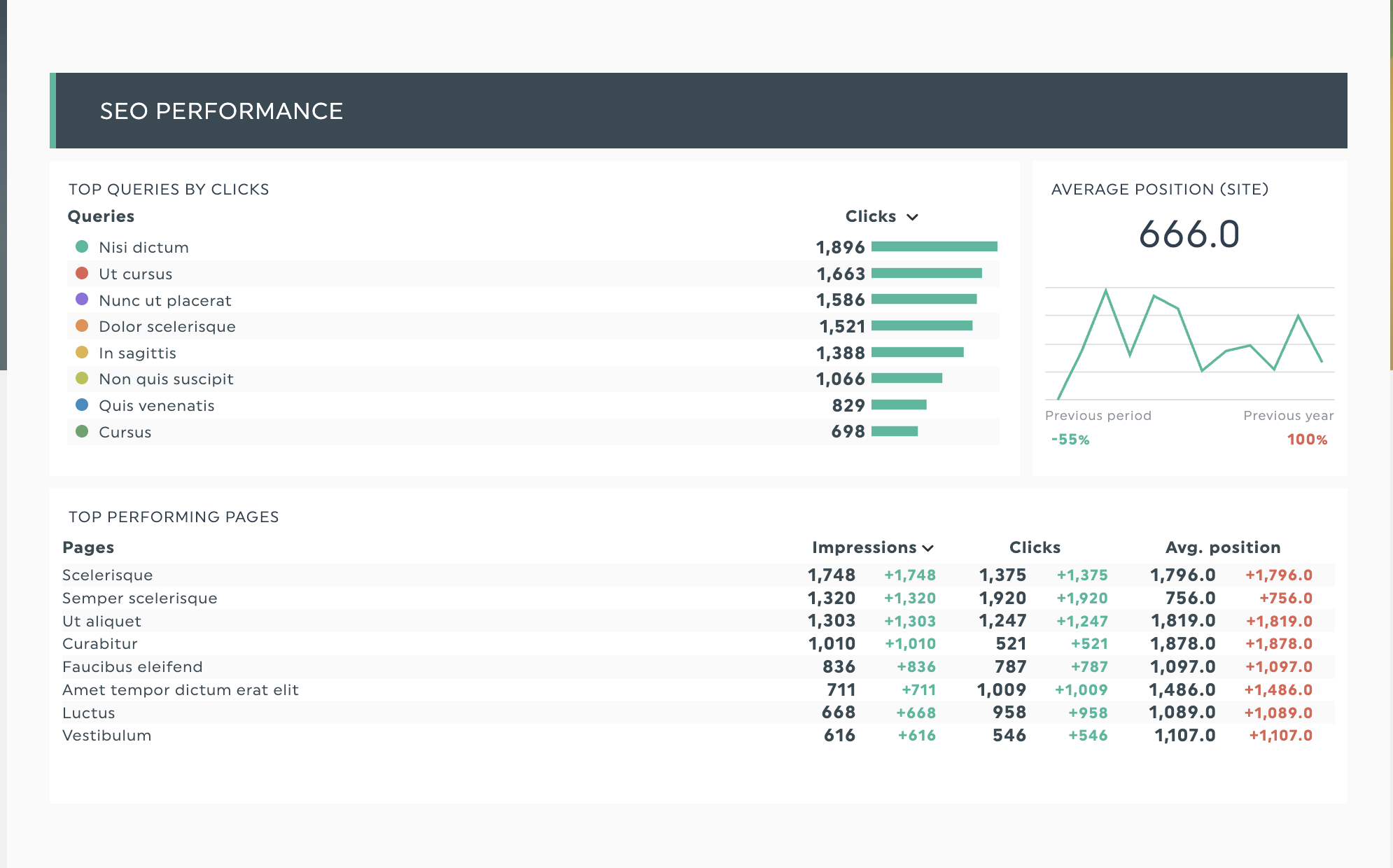 As apresentações de dados de SEO geralmente incluem vários números e métricas. Suponha que pretenda destacar as suas melhores páginas de destino como principais candidatas para o trabalho de velocidade da página. O nosso modelo de relatório de SEO pode mostrar a evolução mês a mês com uma pequena tabela de posição média e cliques.