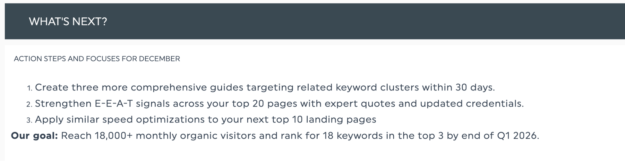 Objetivo: Alcançar mais de 18.000 visitantes orgânicos mensais e classificar 18 palavras-chave entre as três primeiras posições até o final do primeiro trimestre de 2026.