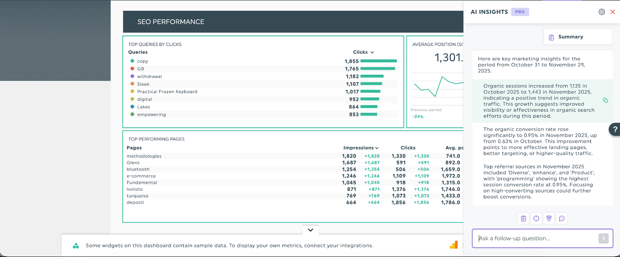 A IA pode ajudar na sua análise, identificando padrões nos seus dados históricos que poderiam passar despercebidos. A IA do DashThis pode mostrar que uma velocidade de página mais rápida está associada a taxas de rejeição mais baixas e classificações mais altas, ou que as atualizações de conteúdo elevam constantemente as posições das palavras-chave relacionadas, ajudando-o a confirmar mais rapidamente o que está a funcionar.