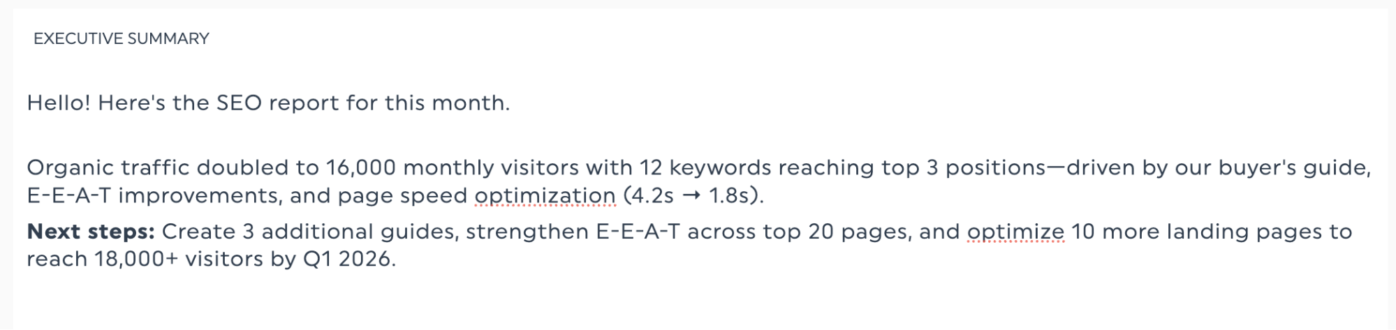 «Nos últimos 30 dias, o tráfego orgânico aumentou de 8.000 para 16.000 visitantes mensais, e 12 palavras-chave passaram para as três primeiras posições.»