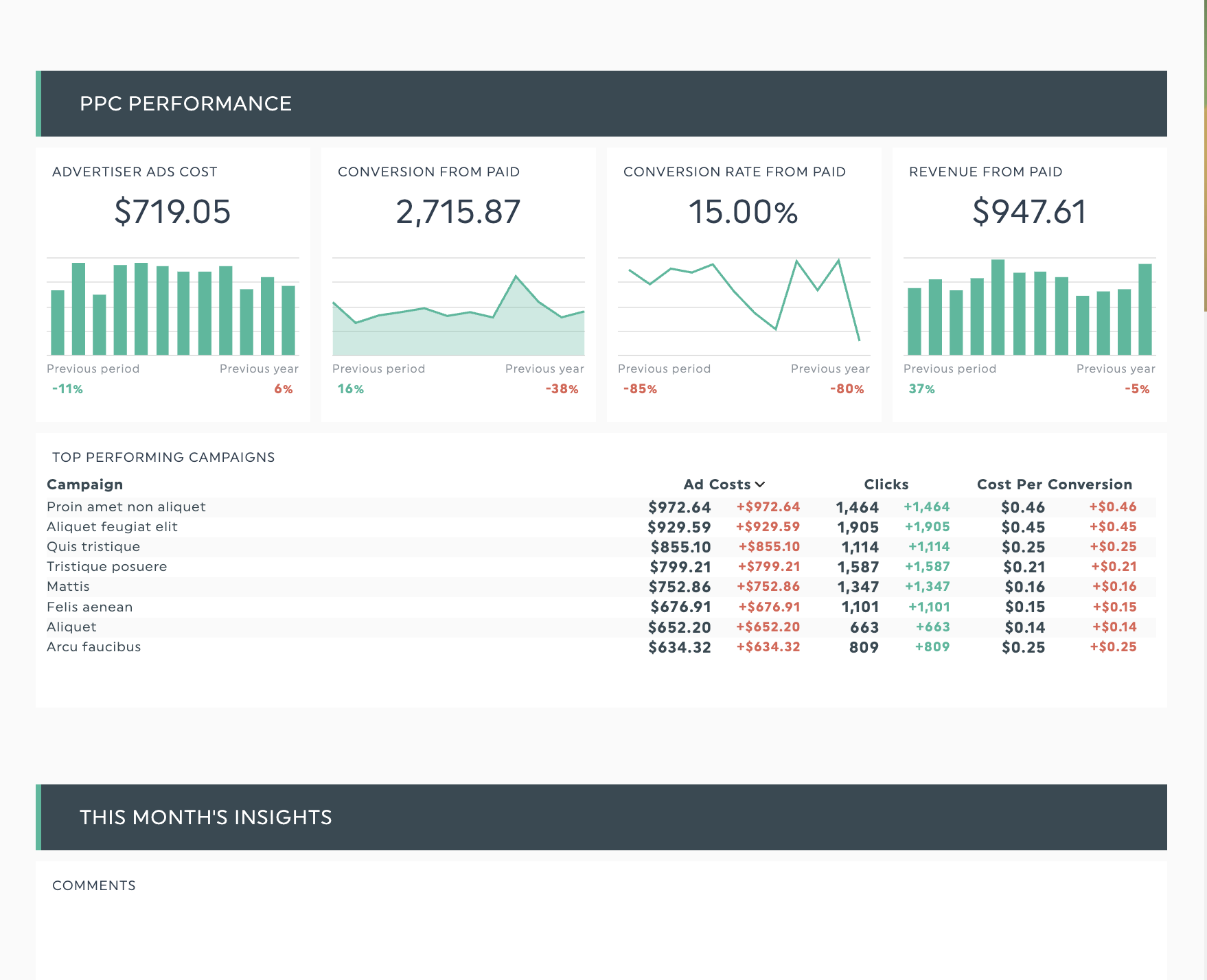 O DashThis oferece mais de 50 modelos pré-construídos que estruturam automaticamente relatórios de marketing e análises de dados, para que possa se concentrar em fornecer insights em vez de se preocupar com a formatação. Incluímos sugestões sobre quais pontos de dados destacar e destacar para esses modelos.