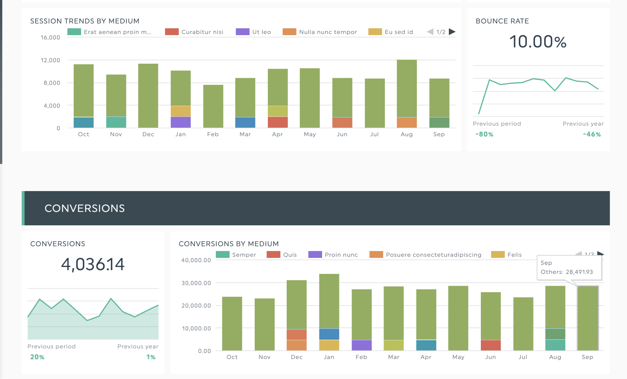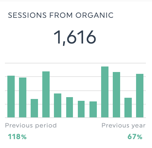 Aqui, um gráfico de colunas empilhadas divide os totais em componentes e acompanha as alterações ao longo dos períodos de tempo. Este formato apresenta eficazmente métricas de SEO, como a percentagem de tráfego orgânico ou o total de conversões de fontes orgânicas ao longo dos meses. A comparação clara entre períodos de tempo pode ajudá-lo a mostrar o impacto dos seus resultados de SEO e a reforçar o seu caso durante uma análise da campanha do cliente.