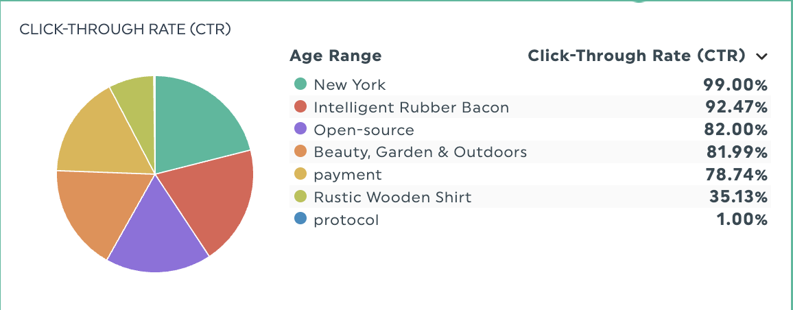 Alternativamente, os gráficos de pizza funcionam bem para dividir as métricas agregadas em categorias. São úteis para segmentar listas de correio eletrónico em grupos de público distintos ou para analisar as taxas de cliques em diferentes faixas etárias.