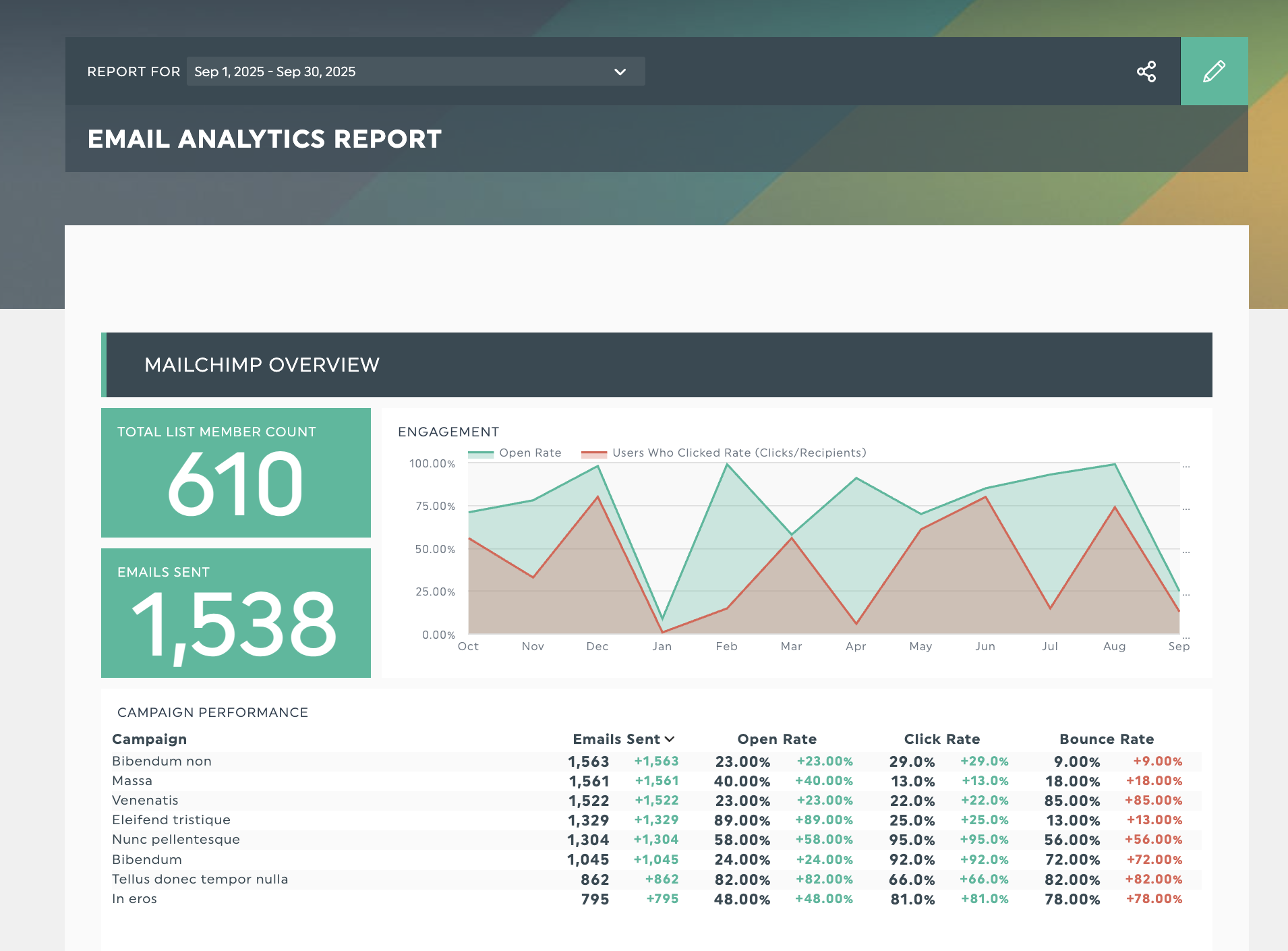 Os relatórios de marketing por correio eletrónico mostram números brutos (tamanho da lista, aberturas, cliques) e percentagens (taxa de abertura, taxa de rejeição). Para avaliar se as suas linhas de assunto necessitam de um teste A/B, trace a sua taxa de abertura e a taxa de cliques (CTR) num gráfico de linhas para detetar padrões na forma como os assinantes interagem com os seus e-mails.