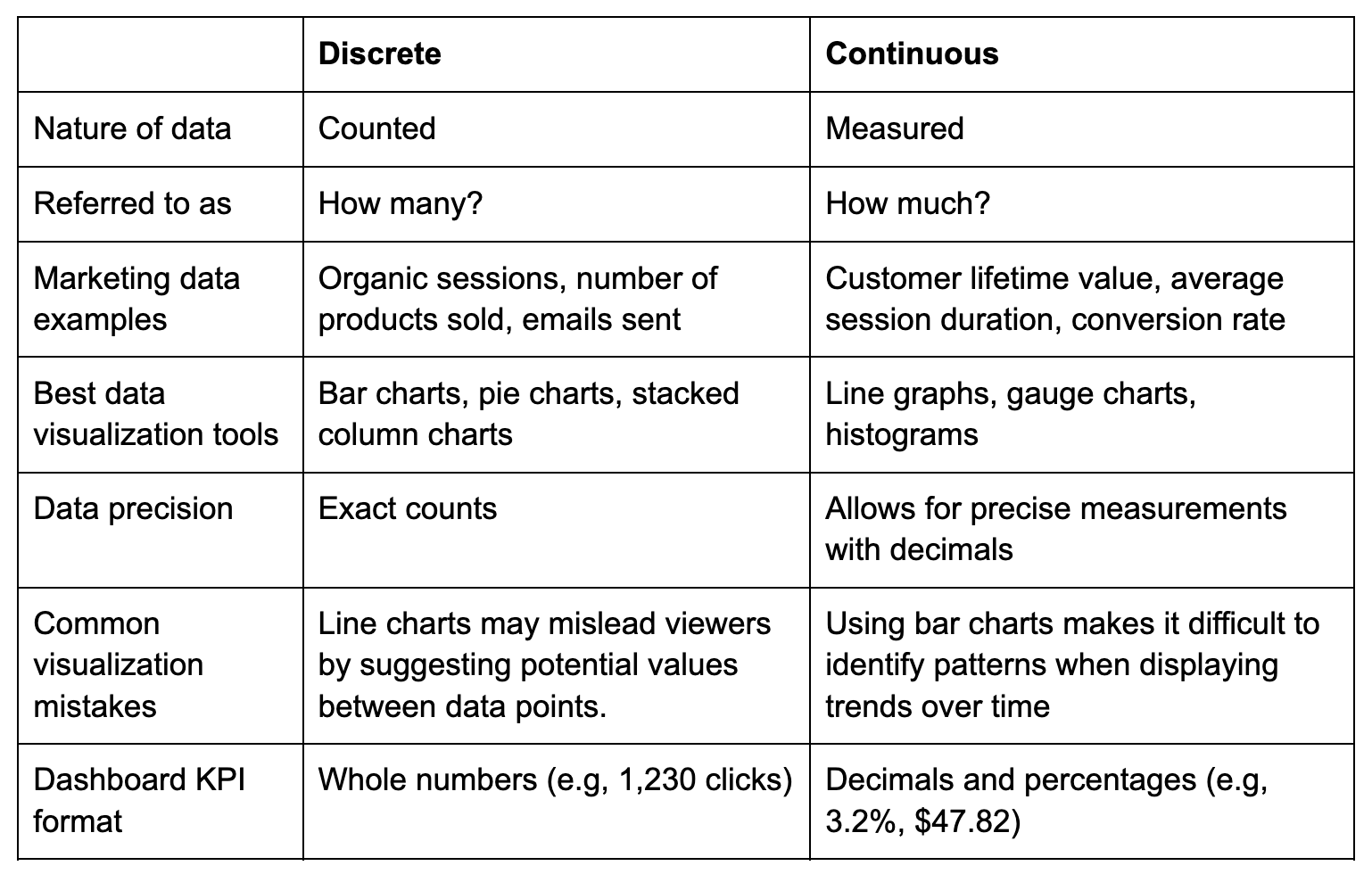 Ao trabalhar com dados de marketing, irá encontrar diferentes tipos de dados quantitativos, incluindo dados discretos e contínuos. A visualização correta destes tipos de dados aumenta a credibilidade do seu relatório e ajuda os clientes a tomar melhores decisões.