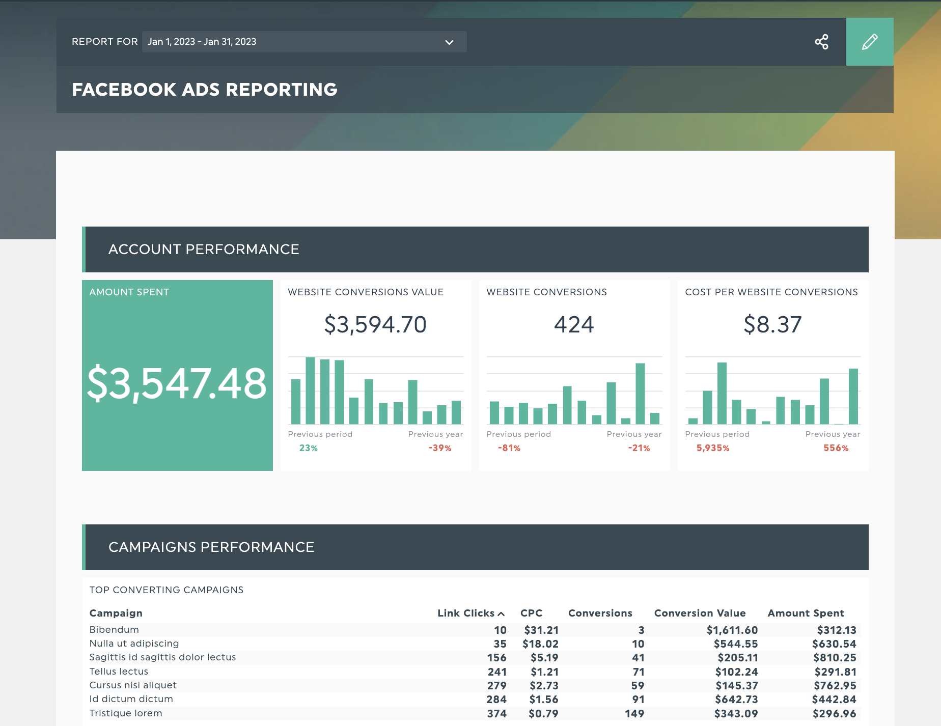 Quando tiver um relatório para identificar os seus melhores anúncios do Facebook e monitorizar o desempenho da campanha ao longo do tempo, é mais fácil ver o impacto de quaisquer ajustes de campanha ou testes A/B nos KPIs da sua campanha.