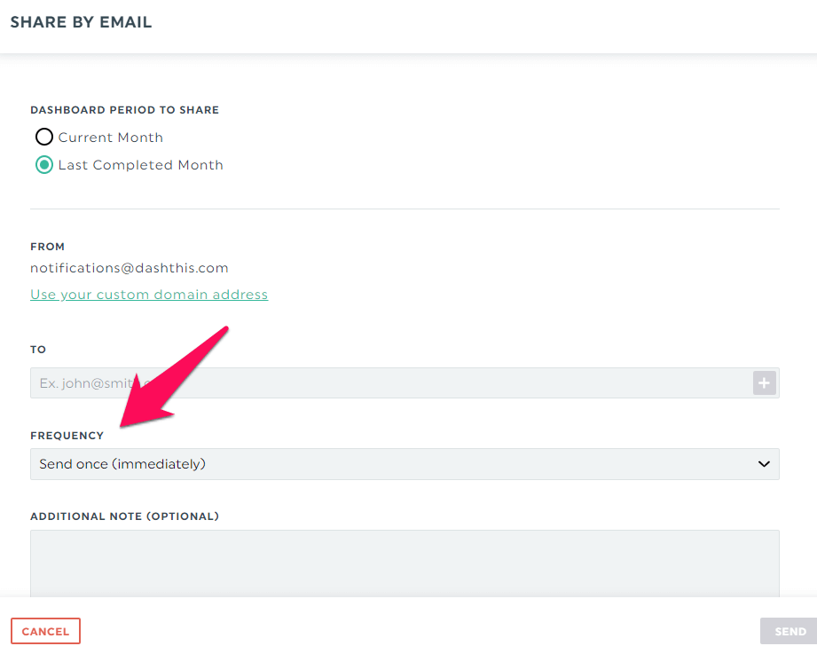 Esta funcionalidade de envio automático de correio eletrónico permite-lhe defini-lo uma vez, diariamente, semanalmente, mensalmente ou trimestralmente. O DashThis agendará automaticamente os relatórios de acordo com o período de tempo escolhido. Não há necessidade de se preocupar com relatórios perdidos ou atrasados novamente!