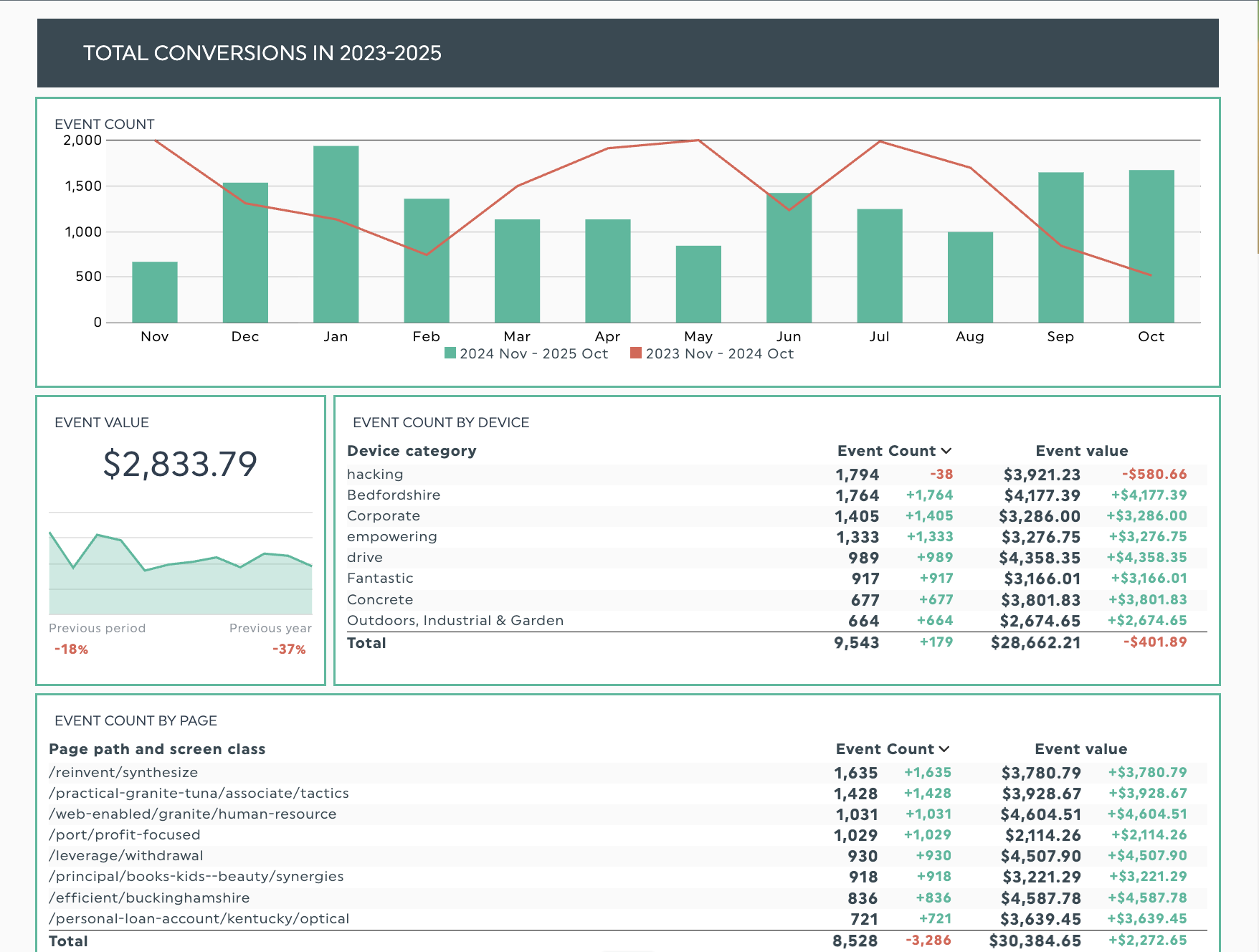 A taxa de conversão caiu de 4,2% para 2,8% (queda de 33%) nas principais páginas de destino nos últimos 30 dias.